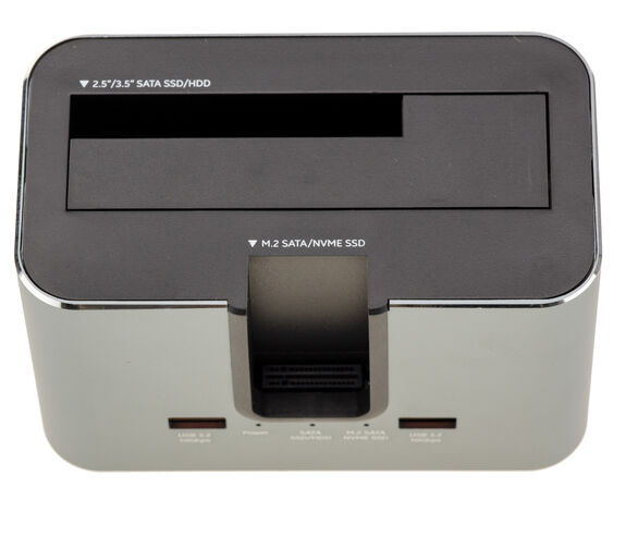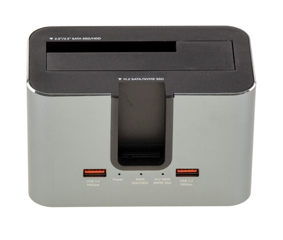 Double baie indépendante : Baie SATA 2,5"/3,5" compatible HDD/SSD, et Slot M.2 compatible NVMe (PCIe) & SATA (B-Key / M-Key).