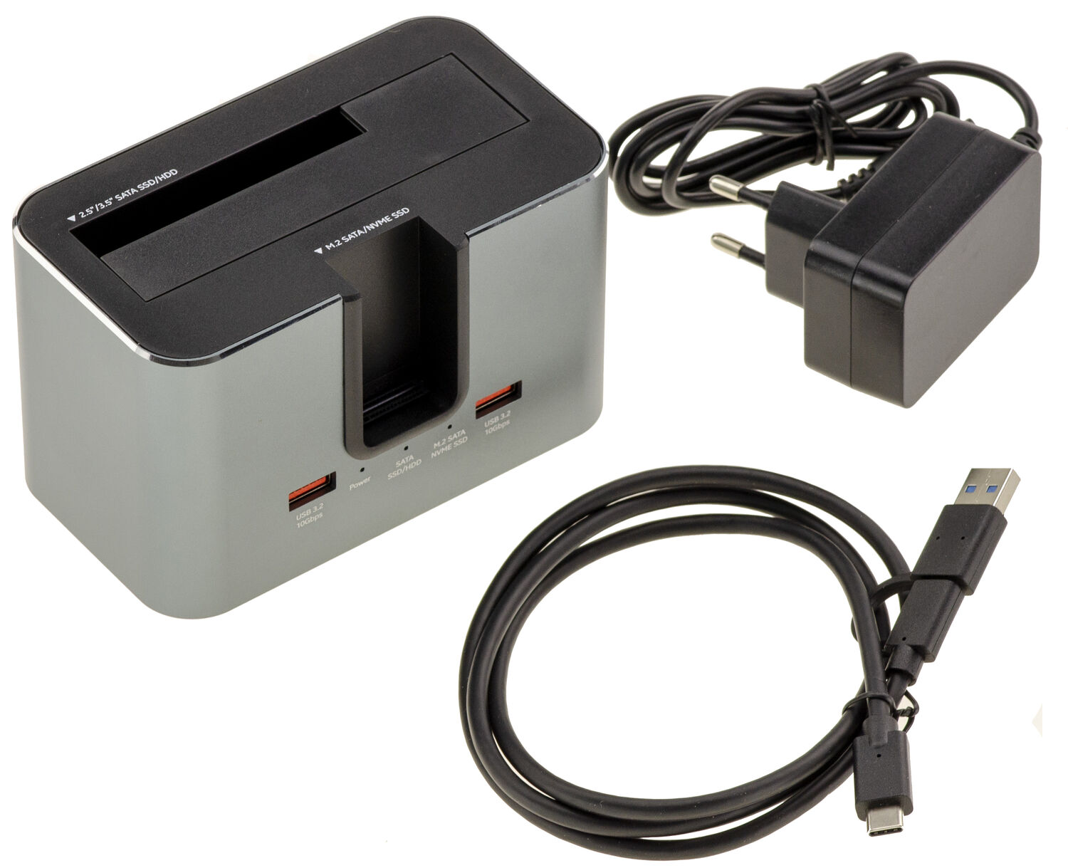 Dock à double interface hybride, conçu pour la lecture simultanée de disques SATA 2,5"/3,5" et de SSD M.2 NVMe ou SATA, tout en assurant un débit hautes performances via un lien USB 3.2 Gen 2 Type-C 10 Gbps.